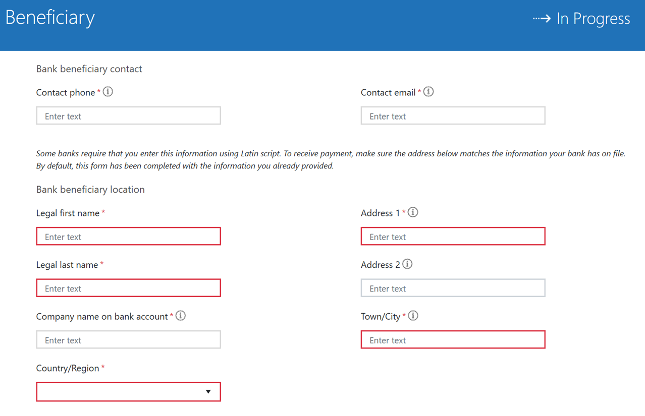 - Bank information entered in Partner Center in Latin characters is translated to Cyrillic characters.