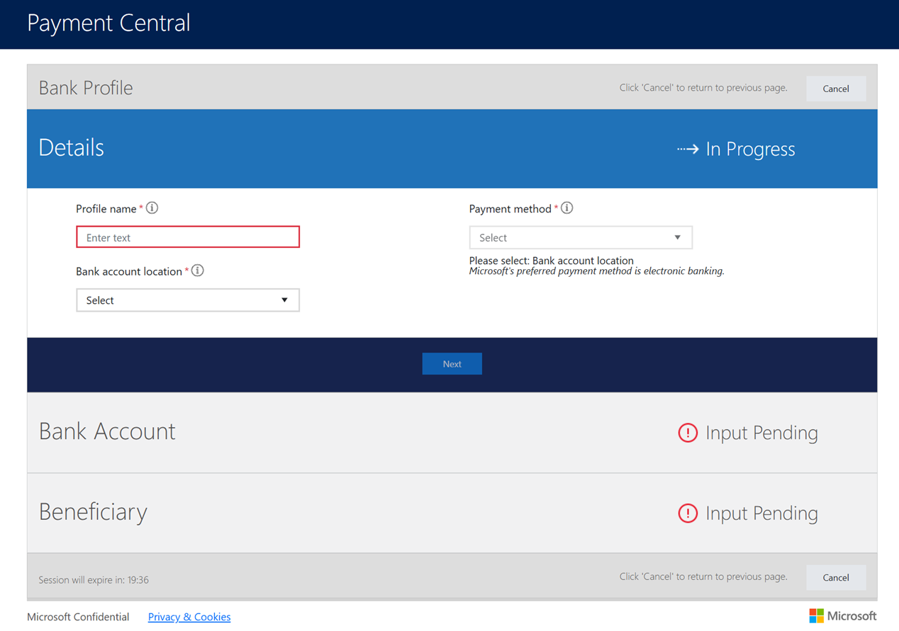 On the Bank Profile page, provide the required information about your bank.