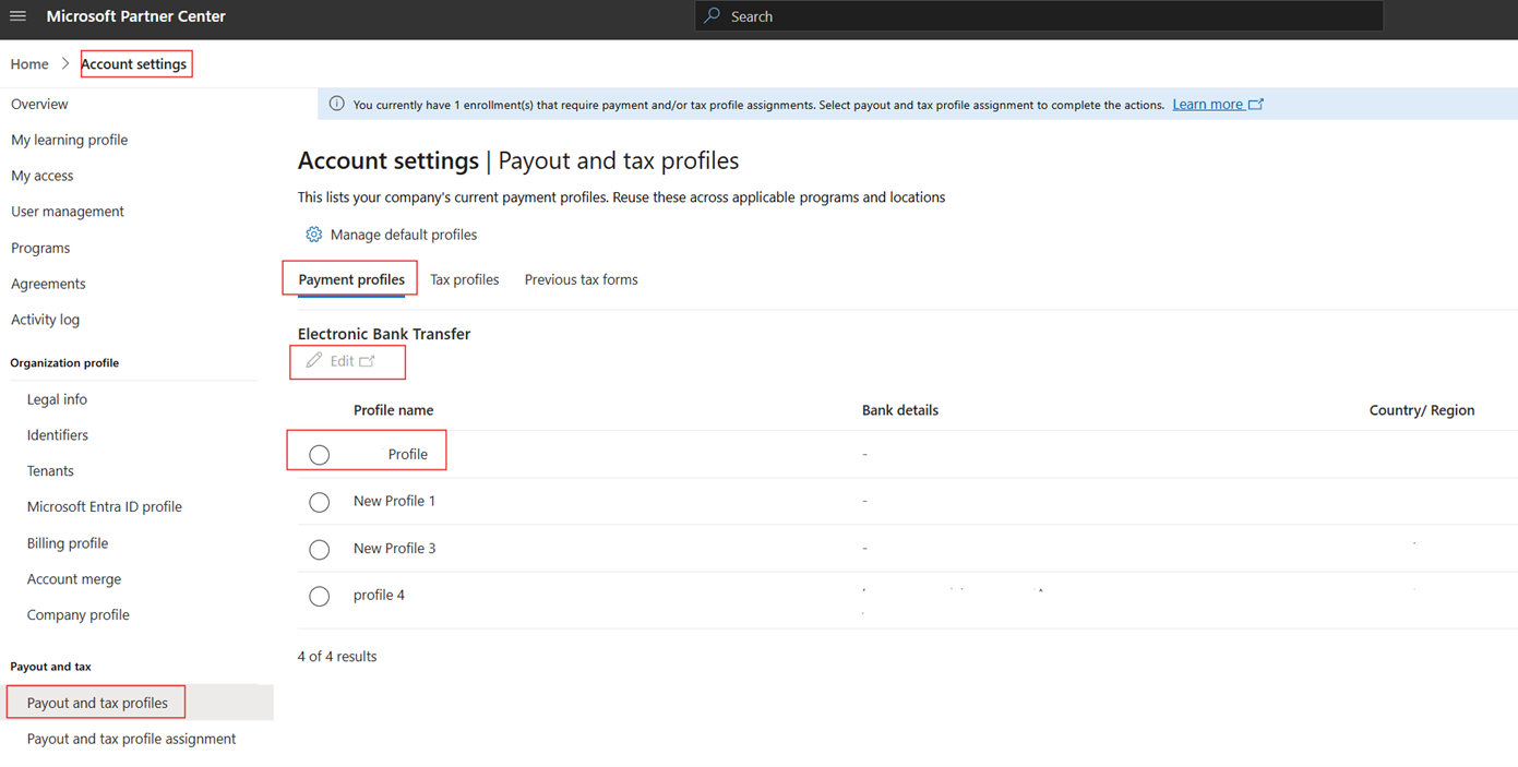 - Your Tax profiles are listed along with their status. Find the profile that you want to edit and select Edit. You'll be redirected to another Microsoft site to complete your details.