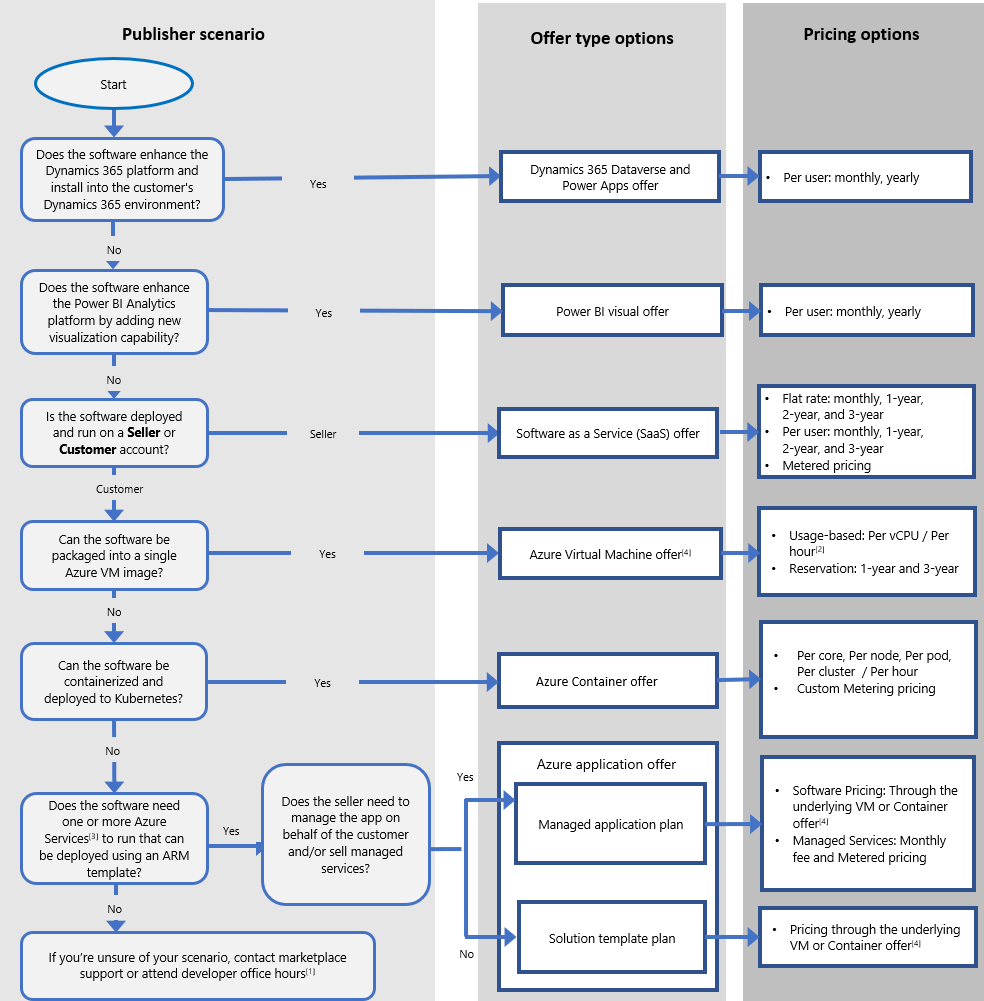 Use this flowchart to determine the appropriate transactable offer type and pricing plan to sell your software in Microsoft Marketplace. This chart assumes that as the publisher, you have a clear understanding of your software delivery and licensing/billing models.