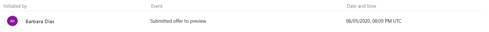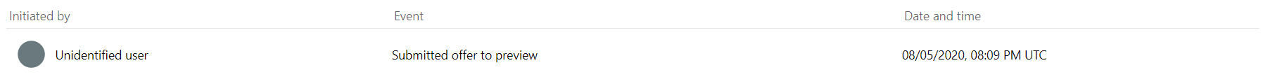 | Initiated submit to preview cancellation | A user requested to cancel the offer publication to preview by selecting Cancel publish from the Offer overview page after the submission to preview. This event is displayed as the cancellation request is being processed. |