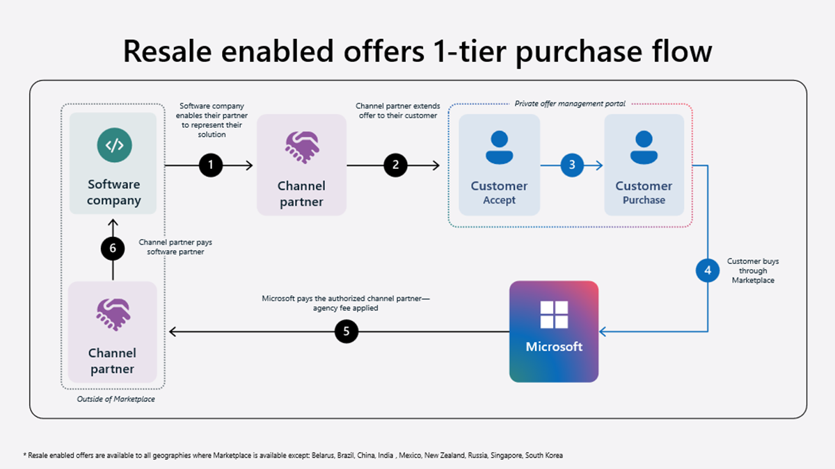 The ISV and the selling partner create an offer in Partner Center. After the offer is created, the selling partner extends the offer to the customer through Microsoft Marketplace. The customer purchases through Microsoft Marketplace. Microsoft then pays both the selling partner and the ISV.