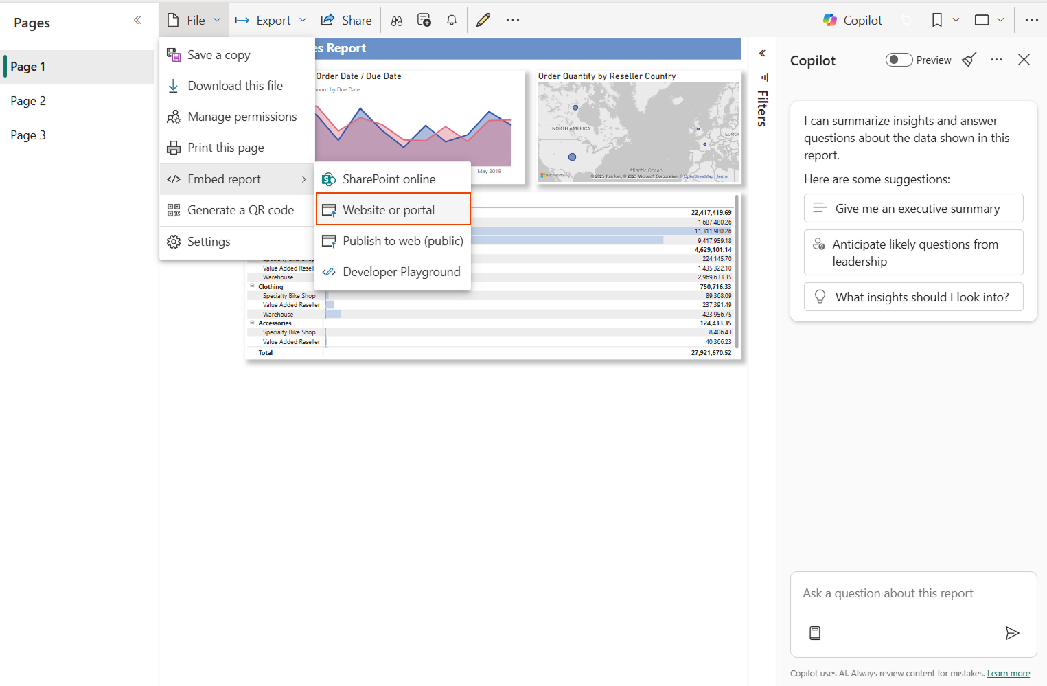From the File menu, select Embed report, then select Website or portal.