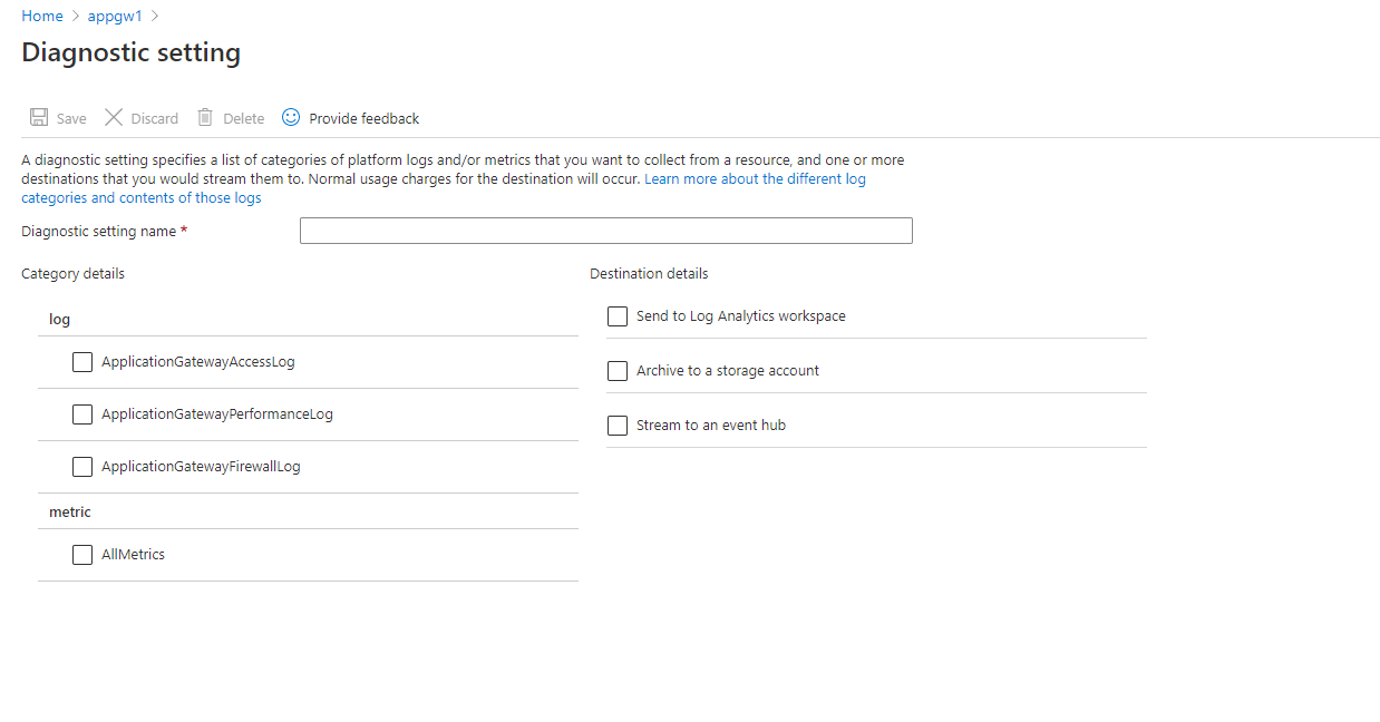 Screenshot that shows the Diagnostic settings config for an Application Gateway resource.