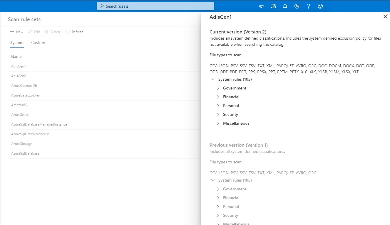 Each system scan rule set has a Name, Source type, and a Version. If you select the version number of a scan rule set in the Version column, you see the rules associated with the current version and the previous versions (if any).