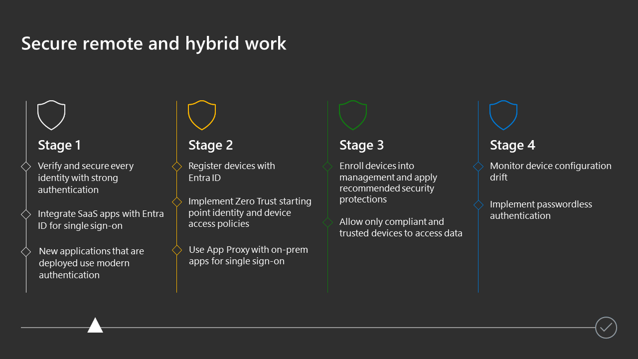 Each of these business scenarios breaks down the work of Zero Trust into manageable pieces that can be implemented over four implementation stages. This helps you prioritize, move forward, and track work as you move through the different layers of implementing a Zero Trust architecture.