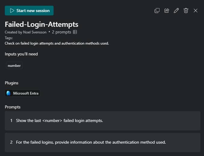 In the screenshot that follows, the promptbook is named Failed-Login-Attempts and it includes two prompts. The first prompt was originally to show the last three failed logins. To configure the number as an input parameter, select the ellipses next to the prompt to edit it by replacing the number 3 and entering <number>.