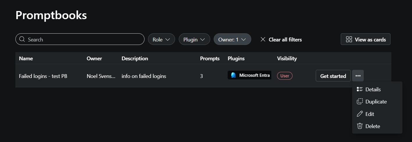 In addition to editing, you can also choose to view the details of the promptbook, duplicate it, or delete it. You can also choose to run the promptbook by selecting the Get started button.