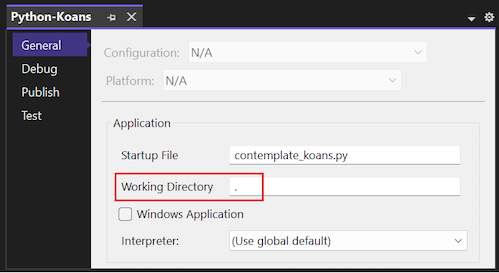 4. Set the value of the Working Directory to the folder location of the cloned repository, such as C:\Users\contoso\source\repos\Python-Koans.