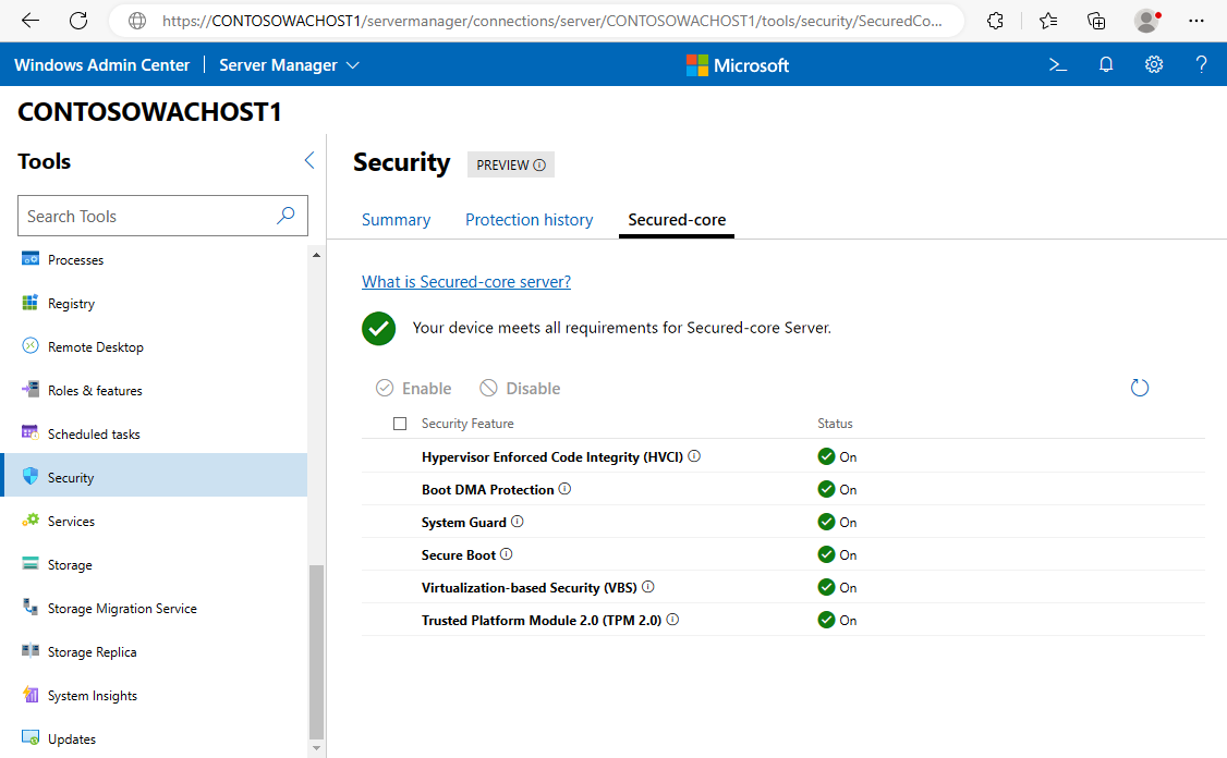 You can view and configure the OS security features of Secured-core systems using Windows PowerShell or the security extension in Windows Admin Center. With Azure Local integrated systems, manufacturing partners have further simplified the configuration experience for customers so that Microsoft’s best server security is available right out of the box.